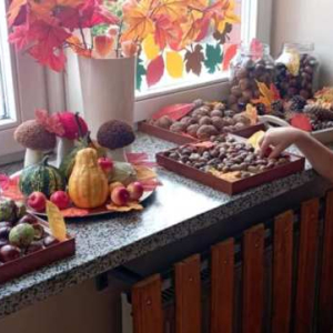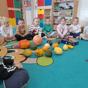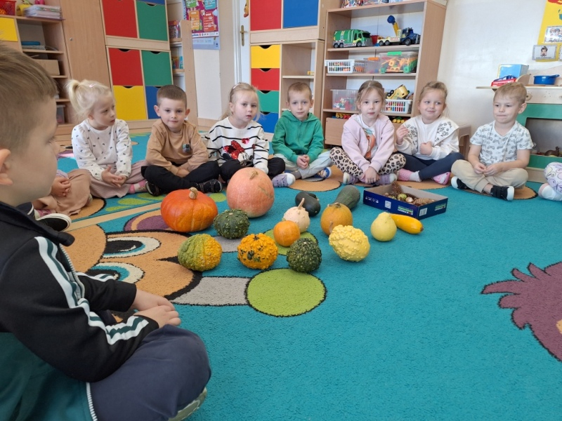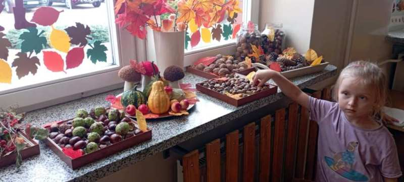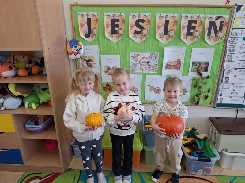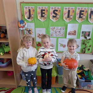 W naszym przedszkolu sezon Jesienny uważamy za otwarty. 23 września oficjalnie powitaliśmy nową porę roku, która będzie panować przez najbliższe miesiące. W Kąciku Przyrody pojawiły się dary jesieni: kolorowe liście, kasztany, żołędzie, owoce z sadu i warzywa. Zajęcia w tym dniu nawiązywały do tematyki jesiennej. Były piosenki, wiersze, zabawy. Dzieci miały okazję wykazać się wiedzą na temat nowej poru roku poprzez rozwiązywanie zagadek, rebusów. Z wielkim zaangażowaniem tworzyły również kolorowe jesienne prace plastyczne. Dzień ten był wprowadzeniem do tematyki związanej z jesienią. Przedszkolaki będą poszerzać swoją wiedzę, obserwować zmiany jakie przyniesie nam nowa pora roku podczas kolejnych zajęć, spacerów i wycieczek.