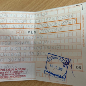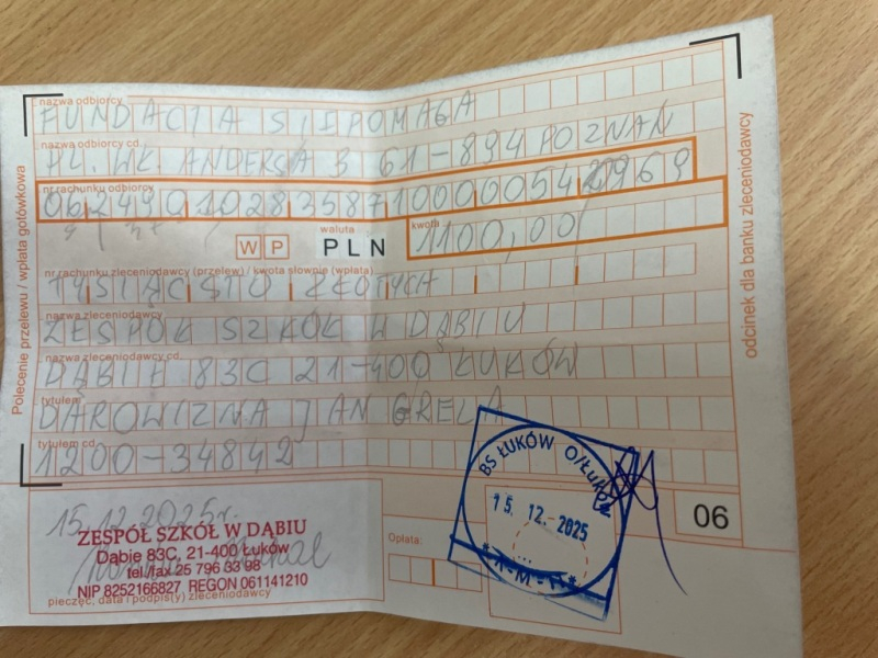 Serdeczne podziękowania dla ludzi dobrego serca Zespołu Szkół w Dąbiu.