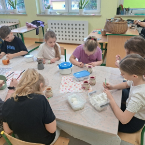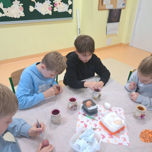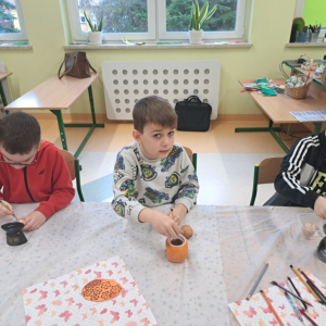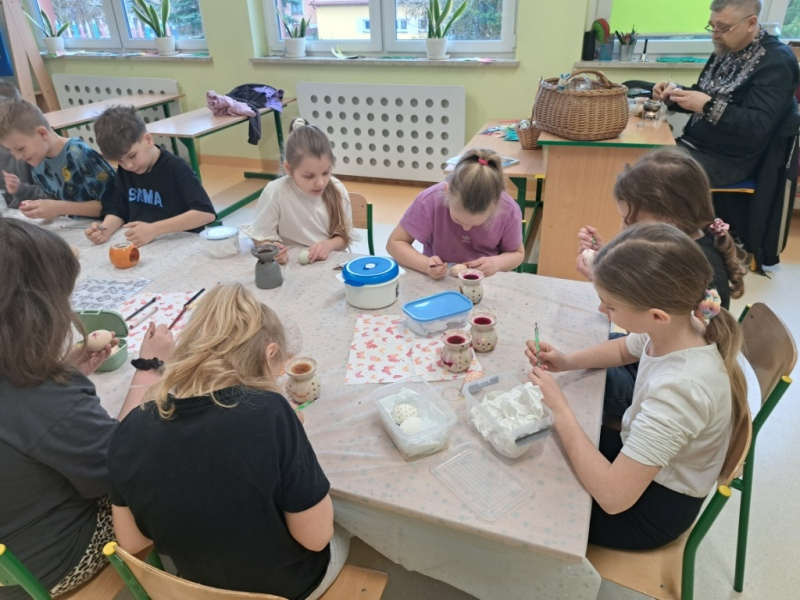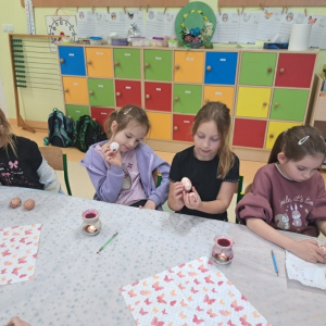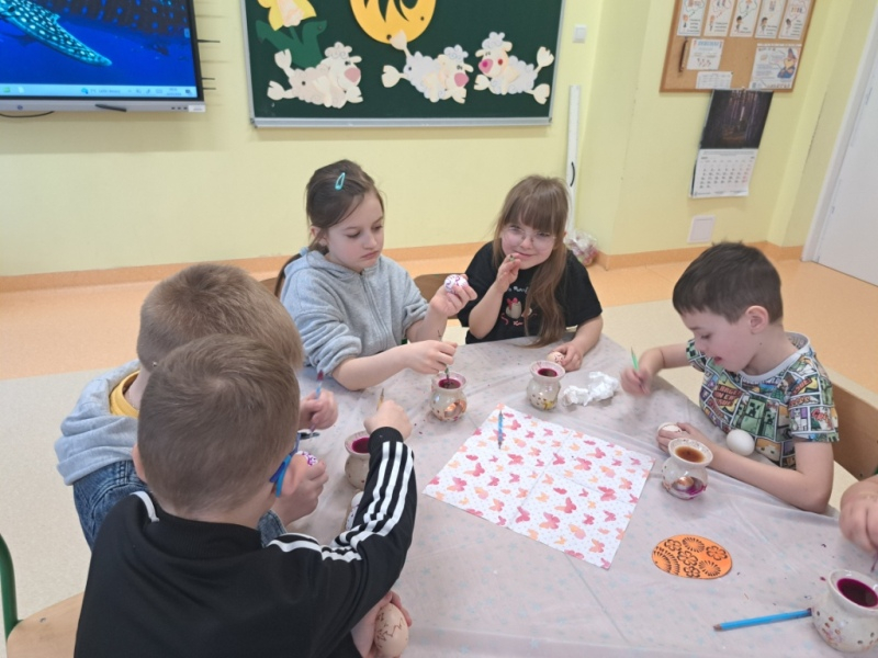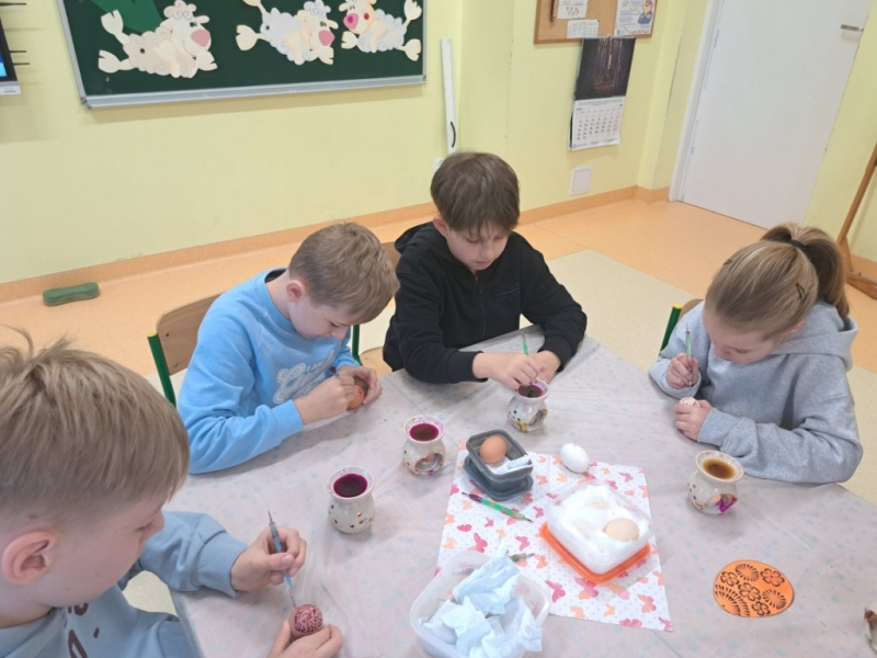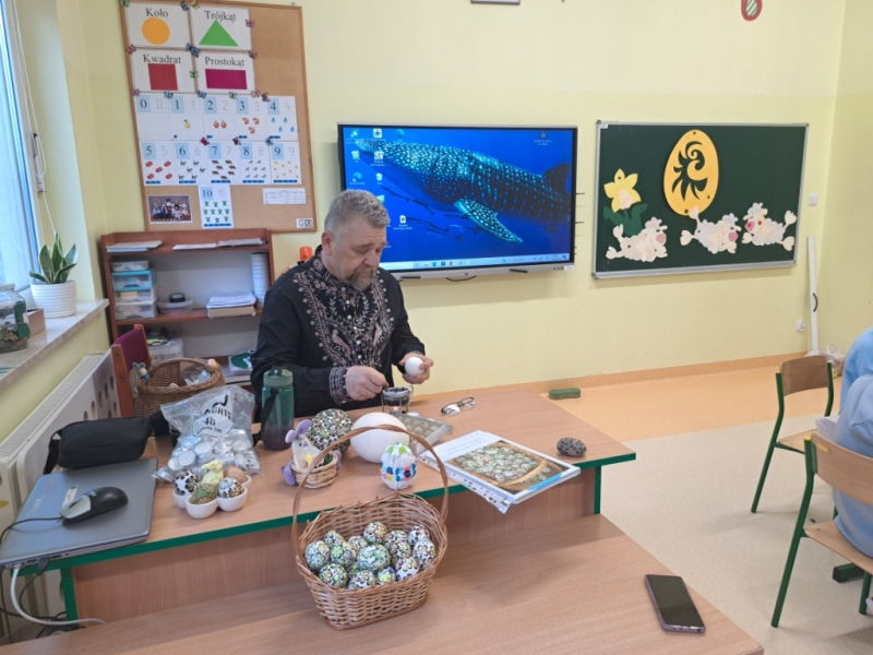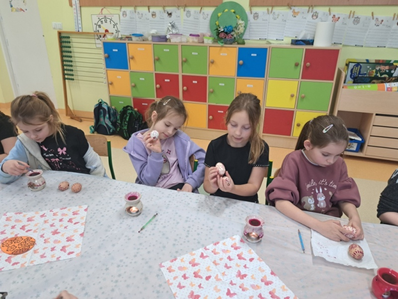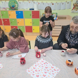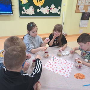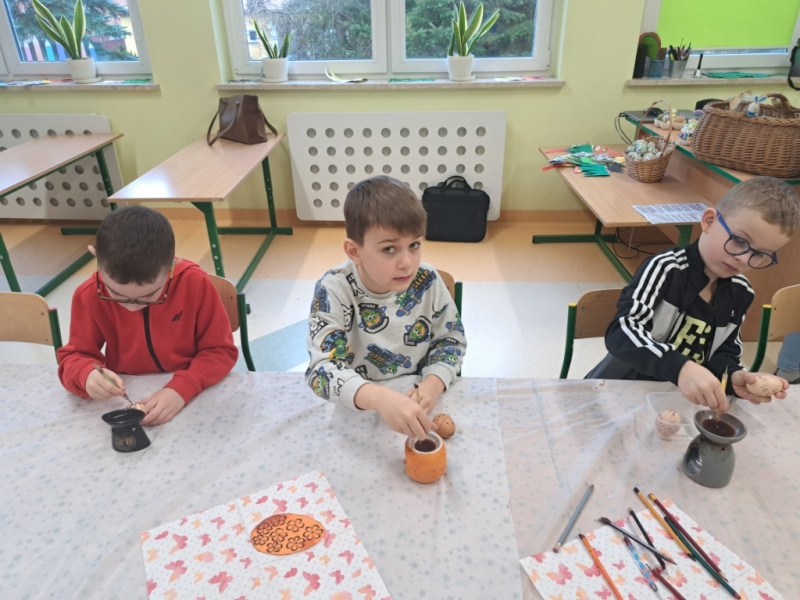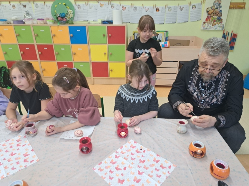 26 marca w Zespole Szkół w Dąbiu odbyły się wyjątkowe warsztaty wielkanocne dla uczniów klas 1–3. Zajęcia były prowadzone przez pana Roberta Czerepińskiego. Główną atrakcją było malowanie pisanek metodą batikową. Dzieci miały okazję poznać tę ciekawą i nieco wymagającą technikę zdobienia, polegającą na nanoszeniu wzorów przy użyciu wosku na jajko. Efekty pracy uczniów były bardzo ciekawe – powstały piękne, kolorowe pisanki o unikalnych wzorach. Podczas warsztatów uczniowie dowiedzieli się także wielu interesujących informacji o zwyczajach Świąt Wielkanocnych. Rozmawiali o symbolice jajka, święconce, a także o tradycjach obchodzonych w Polsce. Była to doskonała okazja do poszerzenia wiedzy i lepszego zrozumienia znaczenia naszych tradycji.