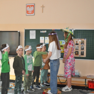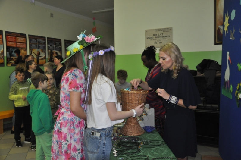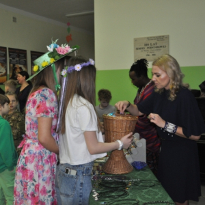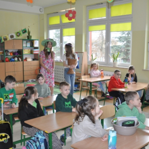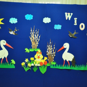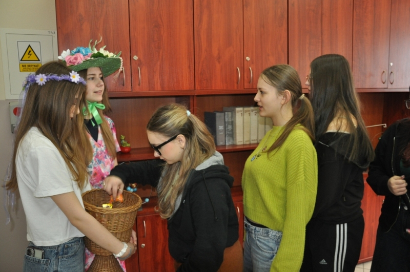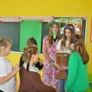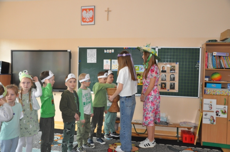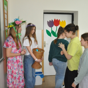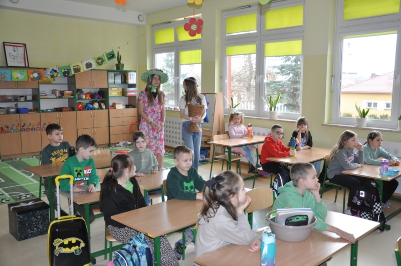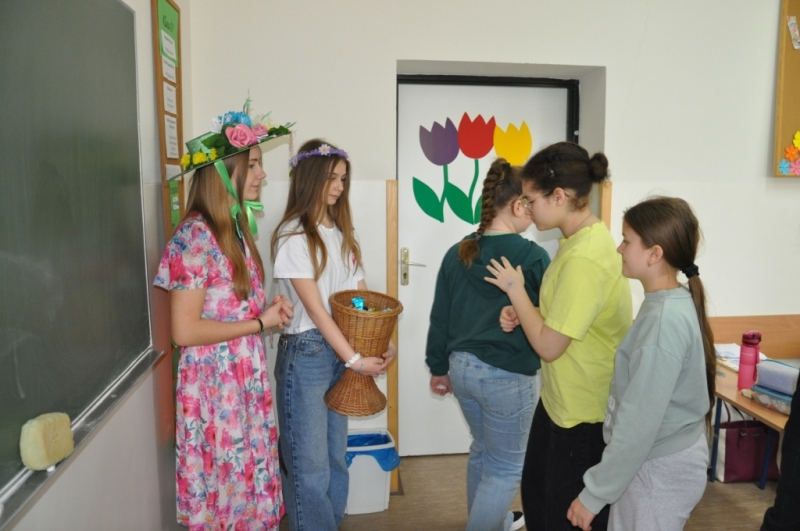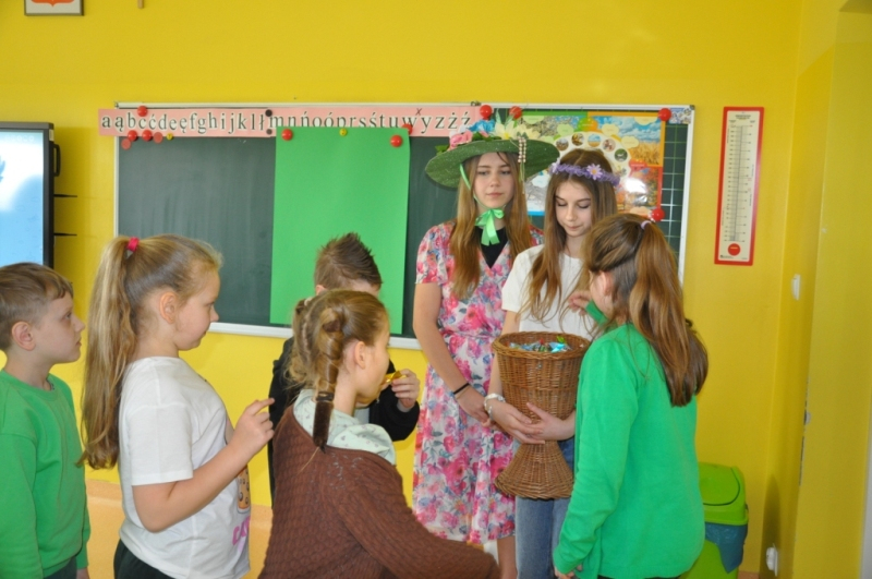 W naszej szkole w piątek 20 marca radośnie powitaliśmy nową porę roku - wiosnę. Już od samego rana uczniów witała Pani Wiosna, obdarowując wszystkich słodkimi upominkami i wprowadzając wyjątkowo pogodny nastrój. Z tej okazji Samorząd Uczniowski zorganizował akcję pod hasłem „Witamy wiosnę”. Tego dnia obowiązywała dobra zabawa i kreatywność. Każdy uczeń, który przyszedł ubrany na zielono lub zaprezentował szaloną fryzurę, mógł liczyć na wyjątkowy przywilej i nie był pytany na lekcjach. Dodatkową atrakcją była inicjatywa przynoszenia przyborów szkolnych w nietypowy sposób – zamiast plecaków pojawiły się kosze, walizki, pudełka i wiele innych oryginalnych pomysłów, które wzbudzały uśmiech i podziw. Naszą szkołę ozdobiły kolorowe kwiaty i motyle. Aby upamiętnić ten wyjątkowy dzień, uczniowie mogli zrobić sobie pamiątkowe zdjęcie na tle specjalnie przygotowanej, wiosennej dekoracji.