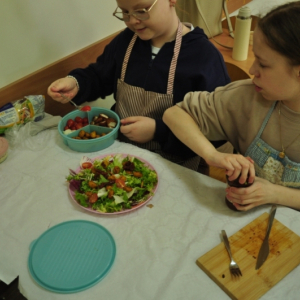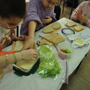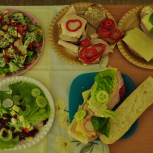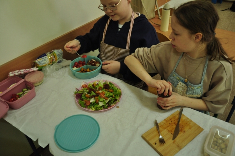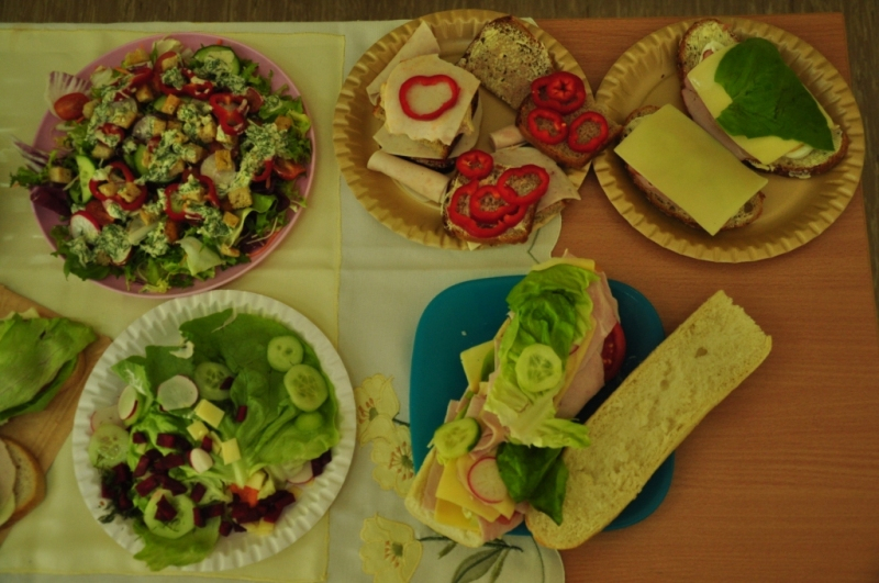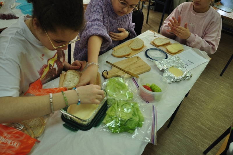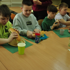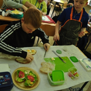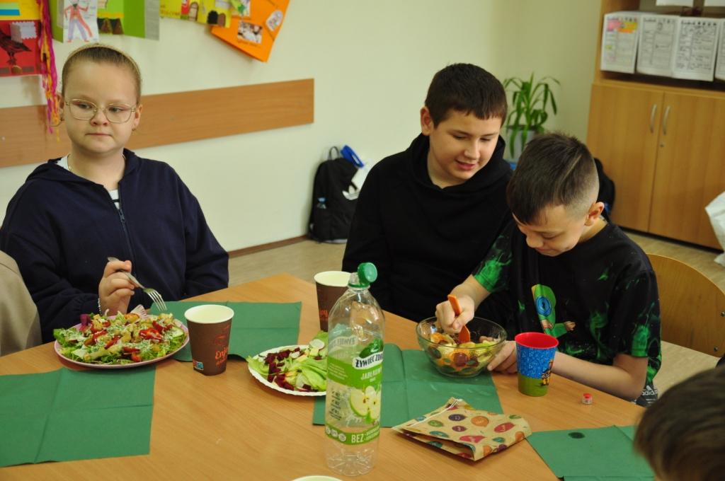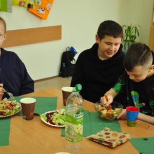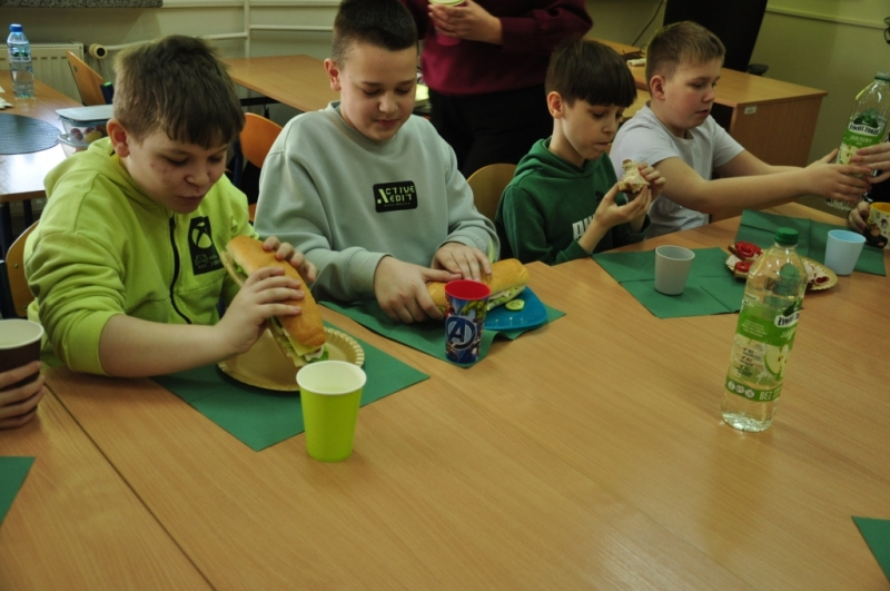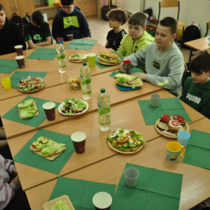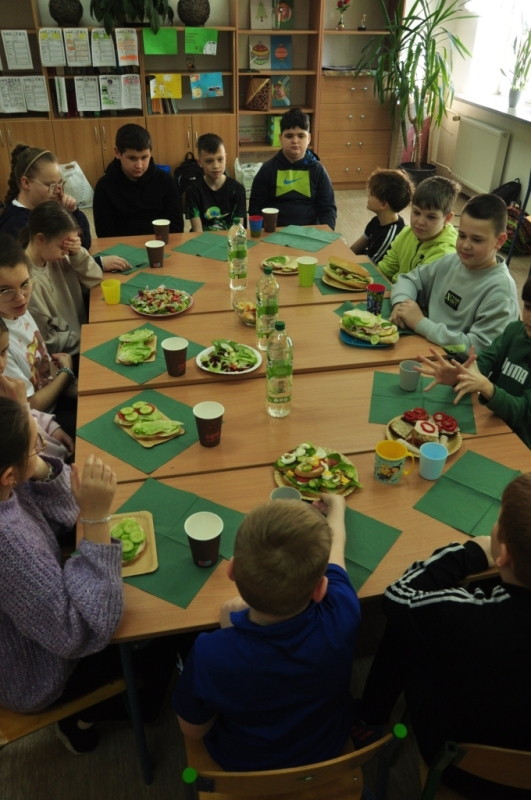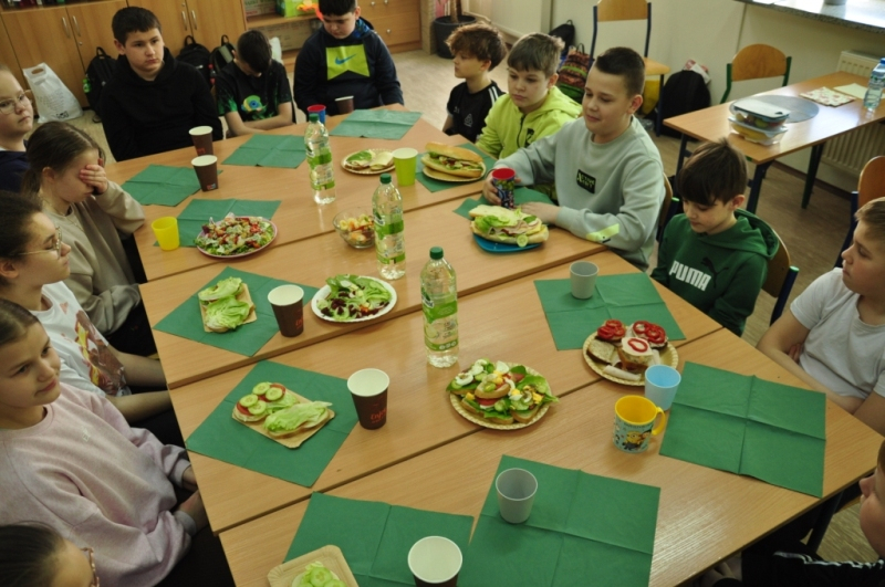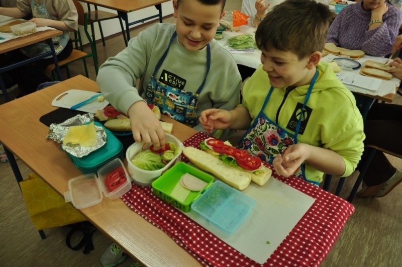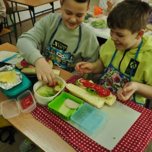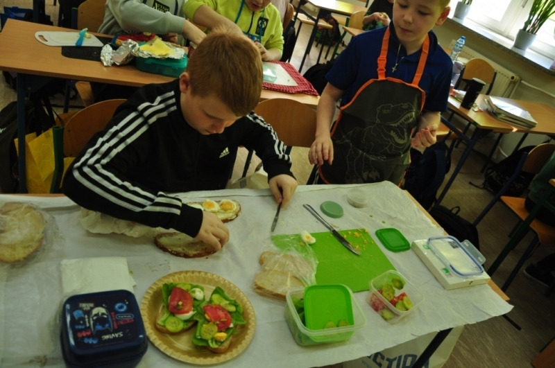 Uczniowie klasy IV, promując zasady prawidłowego odżywiania, przygotowali wspólnie drugie śniadanie. Zabrali się do tego profesjonalnie. Zadbali o przygotowanie stanowisk pracy. Nakryli stoliki obrusami, założyli fartuszki, umyli ręce i wyłożyli na deseczki przyniesione z domu produkty. Oczywiście, były to umyte warzywa, owoce oraz pieczywo. Zanim przystąpili do przygotowania pożywnego śniadania przypomnieli sobie zasady bezpiecznego posługiwania się przyrządami kuchennymi. Następnie ochoczo zabrali się do działania. Bardzo szybko na stolikach pojawiły się smaczne, kolorowe i zdrowe przekąski, kanapki i sałatki. Uczniowie zadbali również o ich estetyczne podanie. Nadszedł w końcu najbardziej oczekiwany moment lekcji, wspólna degustacja przygotowanych smakołyków. Kolorowe przysmaki zniknęły bardzo szybko ze stołu. Czwartoklasiści udowodnili, że nie tylko znają korzyści płynące z diety bogatej w owoce i warzywa, ale także potrafią samodzielnie przyrządzić apetyczne śniadanie.