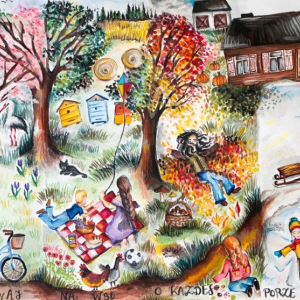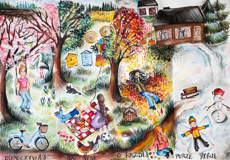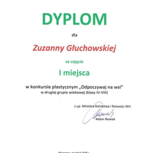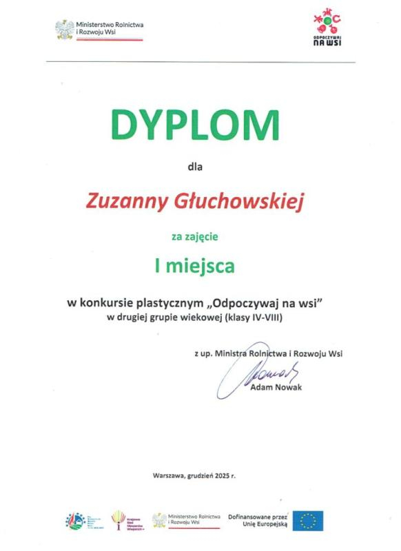 „Odpoczywaj na wsi” to hasło ogólnopolskiego konkursu plastycznego zorganizowanego przez Ministerstwo Rolnictwa i Rozwoju Wsi. Celem konkursu było promowanie wśród uczniów wypoczynku na polskiej wsi, w szczególności z uwzględnieniem walorów naturalnych oraz różnorodności przyrodniczej obszarów wiejskich. Zadaniem konkursowym było wykonanie indywidualnej pracy plastycznej na papierze w formacie A3, w dowolnej technice, na temat wypoczynku na polskiej wsi. Konkurs przebiegał w trzech etapach: szkolnym, wojewódzkim, ogólnopolskim. Przez wszystkie etapy z powodzeniem przebrnęła uczennica klasy siódmej naszej szkoły Zuzanna Głuchowska i w finale ogólnopolskim zajęła I miejsce w grupie wiekowej klas IV-VIII. Oprócz dyplomu Zuzia otrzymała indywidualną nagrodę rzeczową - wysokiej klasy aparat fotograficzny.